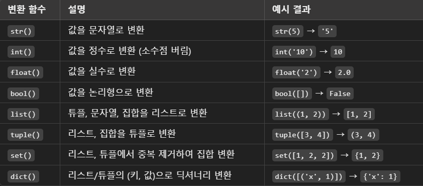 📋 자료형 변환 요약표