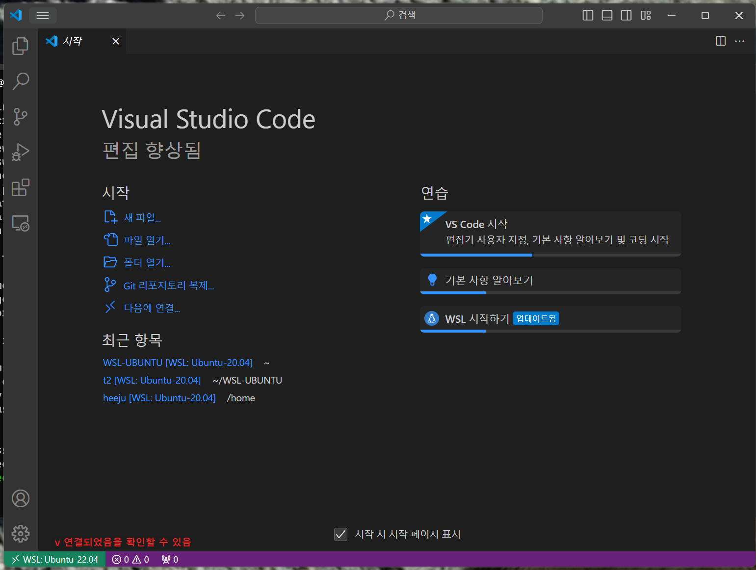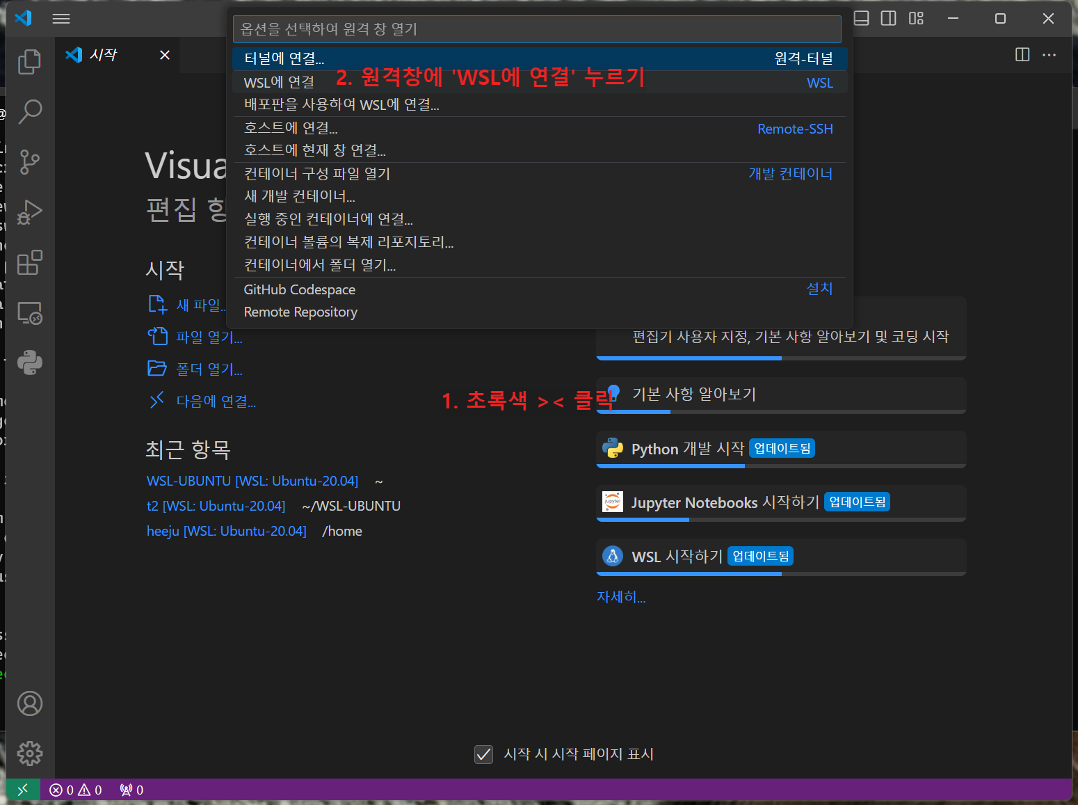 WSL을 설치 후 좌측 하단의 초록색 ><을 클릭하면 원격창이 열리는데 여기서 WSL에 연결하기를 누르면 WSL에 연동되었음을 확인할 수 있습니다.