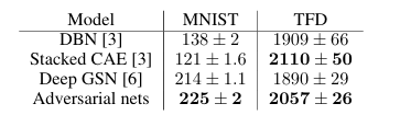 - MINIST 및 TFD 데이터셋을 기반으로 테스트 데이터에 대해서 파르젠 윈도우 기반 로그우도 추정 결과가 나와있음.