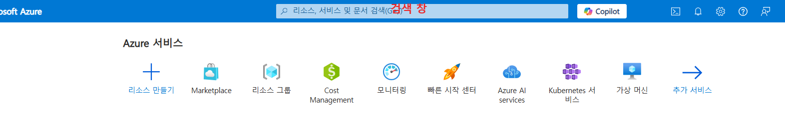 1. Azure 포털 홈 화면 상단에 있는 검색 창을 찾습니다.