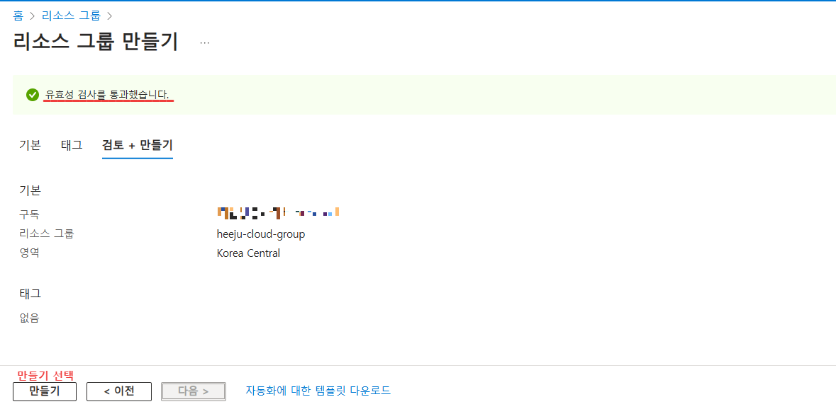 3. Azure가 입력값을 검증합니다. 오류가 없으면 "만들기"를 클릭해 완료합니다.