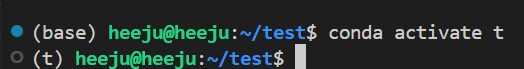 저는 conda activate t로 실행했어요. (base)가 (t)로 바뀐 것이 보이시죠?