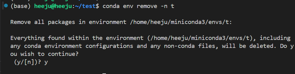 주의! 가상환경이 실행 중일 때는 삭제할 수 없으니 반드시 conda deactivate를 먼저 입력한 후 삭제하세요.