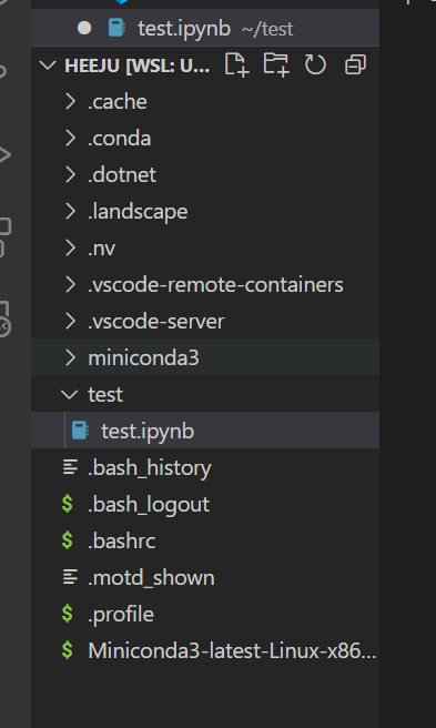 (저의 기준으로는 Miniconda3-latest-Linux-x86_64.sh, miniconda3, test가 있어요.)