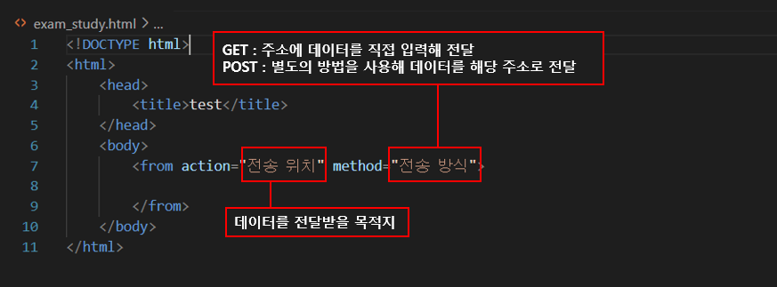 - <form>태그는 method속성의 방식으로 action 속성 장소에 데이터 전달